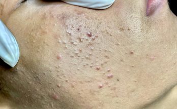 Large 3-4cm abscess on right cheek. Very inflamed nodule came up quickly. Incision and drainage today. Scraped out cyst contents and applied pressure bandage. Now that contents are drained, it …